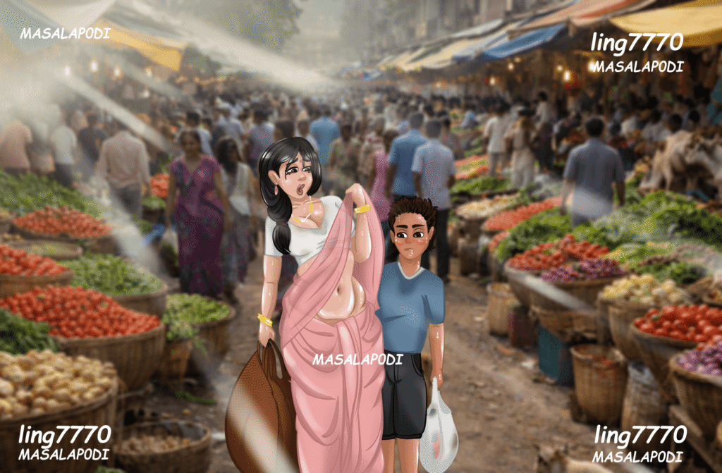 Right there, surrounded by strangers, Meena shifted both heavy bags to her left hand. With her right hand, she reached up and pulled her pallu back into place — but only loosely, without bothering to adjust the pleats or tug the saree higher. She was too tired, too hot, too distracted. Not realising the attention she was drawing, a few heads turned, and soft murmurs rippled through the crowd as her soft, sweaty belly came into view.