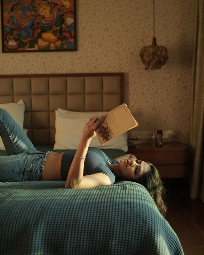 Now that Nivi is at home with her adopted son Deepak, she is now in a navy blue crop top and a light blue denim jeans just like in the pic given below.